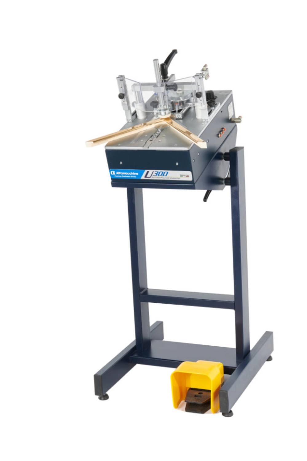 La U-300 est le modèle de machine d’assemblage de table le plus vendu parmi les encadreurs, les bricoleurs et les photographes. Elle est compacte, conçue et construite de sorte à garantir des années de fonctionnement sans problème. L’assemblage des baguettes se fait en déplaçant Manuellement l’équerre et l’angle à agrafer au-dessus de la tête de tir des agrafes chaque fois qu’il faut changer de position. Une fois les deux positions d’extrémité fixées, l’utilisateur peut passer à l’agrafage des positions intermédiaires. Le blocage des baguettes et le tirage des agrafes se fait en appuyant sur la pédale à double fonction. La U-300 est dotée d’un frein qui bloque l’équerre et permet une juxtaposition parfaite des agrafes.